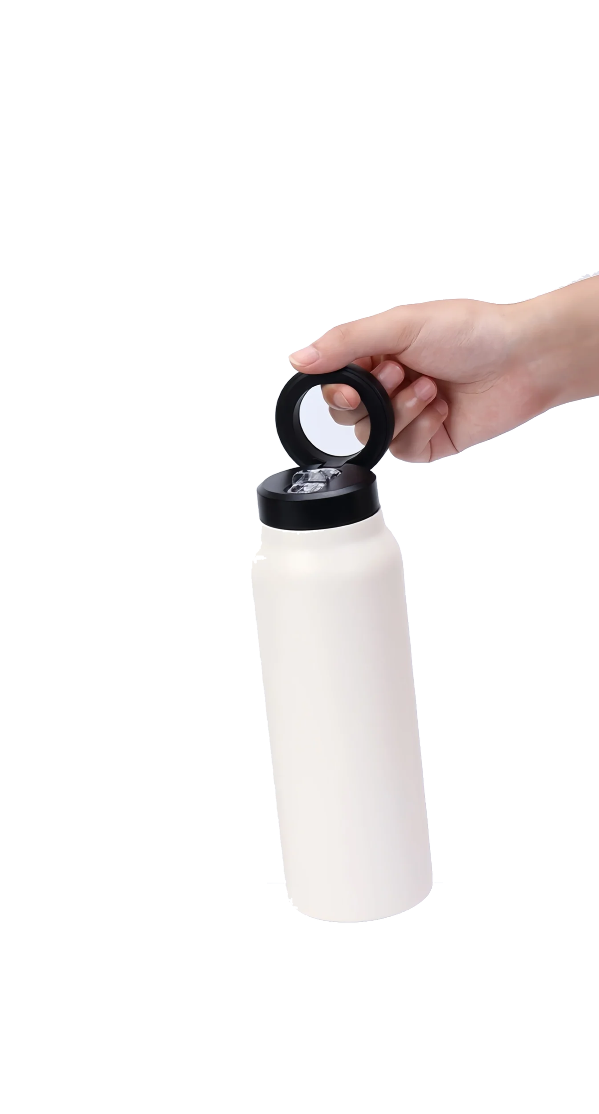 An integrated leak-proof straw flips out for convenient on-the-go sipping.
